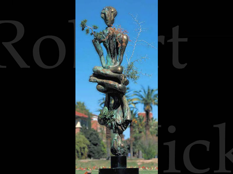 Still Figure Again, a Buddha balances a similar Buddha-like figure, but this timeā¦hip to hip, in the fulfillment of the visual metaphor of balance. Size: 10’ 8” high Material: Bronze Year: 1997 Status: Available - Wick Mule Mountain property