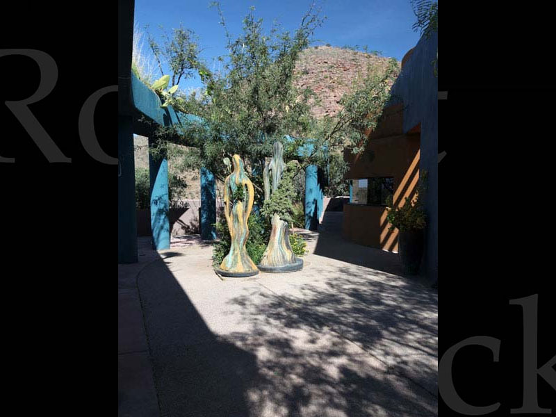 Two vertical sculptures representing male, female, earth, human kind. Life grows from them, in them. They stand as a symbol of the union of this planet, life, humanity.