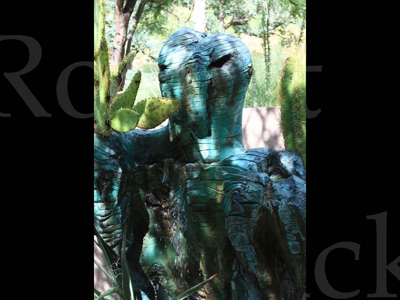 Inspired while walking in a deep arroyo in the Gila wilderness. The challenge was translating that beautiful place into a sculpture. Thus, became an earth Buddha with all its strata, and spilling water. The rock- like shape bulging from the right side of the chest is reason for the name, Right Heart. It designates place and intent.