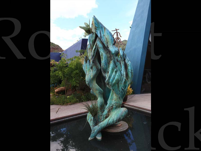 A seated figure, Buddha-like in posture, is open in the center. The internal space suggests the space within each of us. The water spilling from inside represents the source of life and creation.