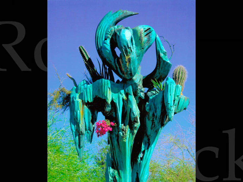 A personification of Mother Earth, the figure is cloaked in a mantle of vegetation. Her head, body and arms are reminiscent of forms derived from rocks and a mesa environment.